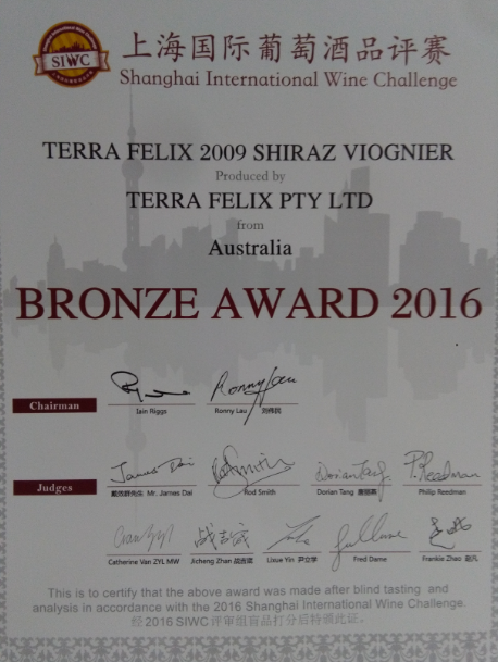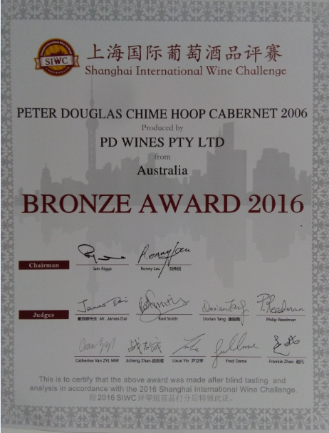 我公司两款澳洲葡萄酒 2009 SHIRAZ VIOGNIER 和 PETER DOUGLAS应邀参加2016上海国际葡萄酒品评赛,在11位来自世界各地的专业评酒大师的品评中获得铜奖。