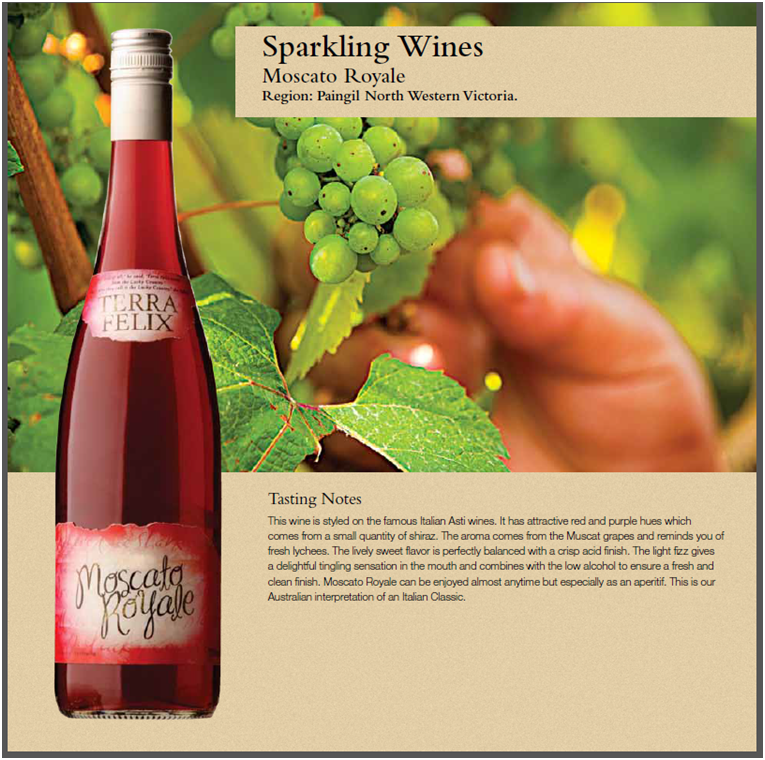 【酒评】这是以意大利著名的Asti葡萄酒制造方法酿制出来的。优美地紫红色来自于少量的色拉子。莫斯卡托的香气散发出新鲜地荔枝果香味。微微的甜味,完美地平衡,最后以清爽结束。微微的气泡和低酒精浓度让口腔中有着清新的感觉。她是一款特别的开胃酒,可以任何时候享用。这是一款澳洲人诠释意大利人风味的酒。